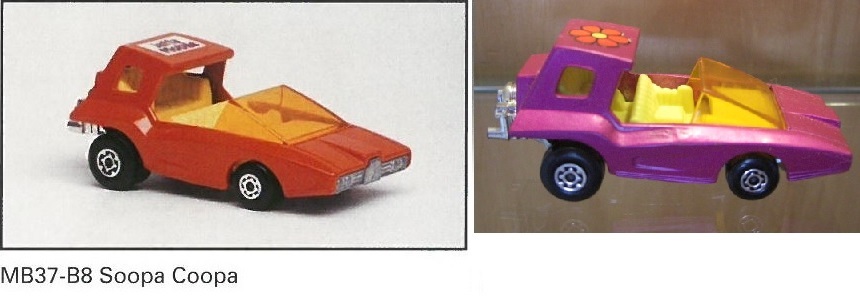 Soopa Coopa – modelo fantasia lançado em 1972 na escala 1:60. O modelo considerado mais raro é promocional de 1977 na cor laranja com o decalque “Jaffa Mobile” na capota. Os modelos de 1972 são azuis em todos os tons, passando de pálido a médio e terminando no escuro. No segundo ano em coleção do modelo (1975) ele saiu em rosa com ou sem o decalque da flor na capota. Há uma variação em rosa fosco. Em seu último ano em coleção (1977) o modelo é cor de laranja sem decalque nos modelos normais de linha e com o decalque promocional na capota do modelo mais raro.