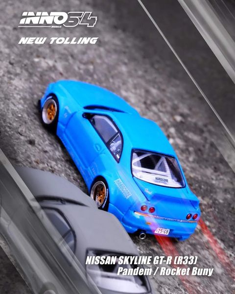 Inno64 – a novidade da marca é o Nissan Skyline GT-R R33 Pandem Rocket Bunny. Nas cores Cement Grey Matte e azul, serão feitos em diecast e lançados em dezembro/2023.